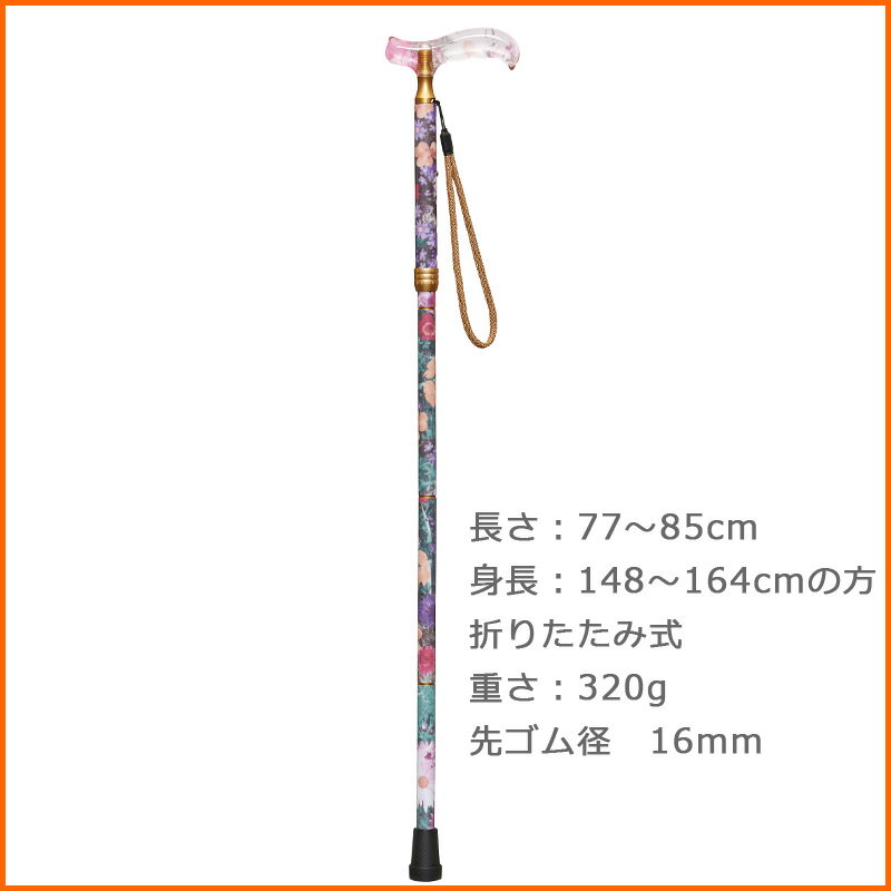 ●安心のSGマーク付き商品名 愛杖 (あいじょう) TEXTILE テキスタイル シリーズ 生地巻 ステッキ色・柄 全2色:ブラック・ホワイト杖の種類杖 折りたたみ杖 (持ち運びに便利)調節機能4段階調節折りたたんだ時の大きさ(cm)26グリップ(杖の手元)の素材アクリル樹脂シャフト(杖の棒部分)の素材アルミステッキの長さ(cm) 77〜85適応身長(cm)【お使いになる方の身長】 148〜164 ※身長が148センチ未満の方は、身長をご連絡下さい!カット後お届けします!ステッキの重さ(g) 320シャフト上部径サイズ(mm)【ストラップを付ける部分】19〜21先ゴム径サイズ(mm) 16※先ゴムサイズは、先ゴム交換時に必要です。